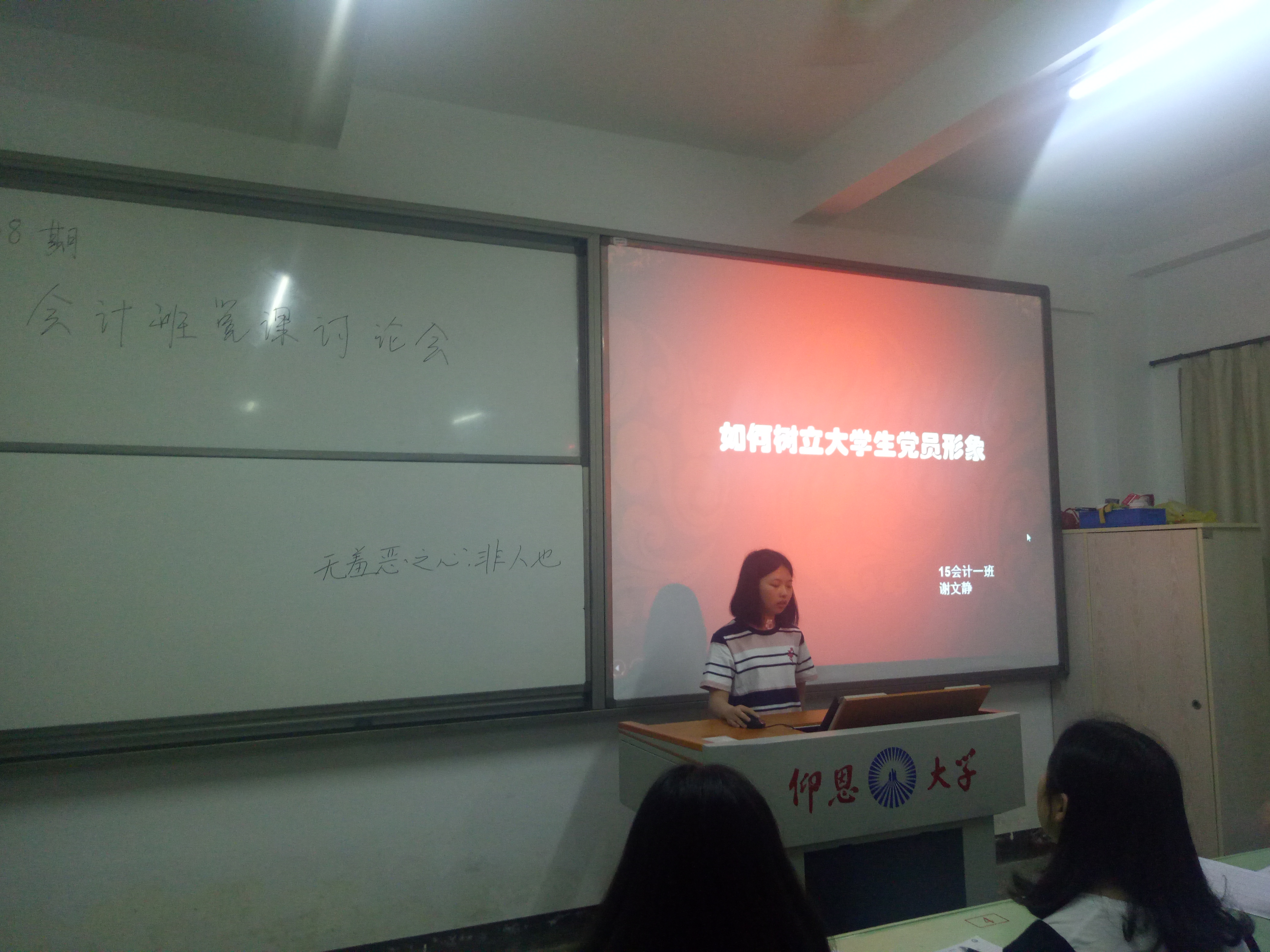 入党积极分子欧阳帆和陈烨分别以“如何树立大学生党员形象”及“不忘初心•牢记使命”为主题,联系实际倡导与会积极分子应以自身行动践行党的十九大精神,争做优秀积极分子,时刻谨记以党员的标准严格要求自己,作为当代大学生党员应不忘初心、牢记使命,积极践行时代赋予青年的历史使命;入党积极分子暨退伍大学生刘可民分享了“厉害了我的国”视频观后感,回顾了党的十八大以来国家取得的重大成就,分析了一个正在崛起的东方大国在方方面面的发展速度和强国兴国的坚定决心,向大家展示了中国的骄傲,激发了同学们的民族自豪感,明确了作为一名入党积极分子应时刻响应党和国家的号召,为祖国更好更快的发展添砖加瓦;入党积极分子罗明丽以“大学生如何端正入党动机”为主题,引导与会入党积极分子端正入党动机,坚定入党的决心,锐意进取、艰苦奋斗、顽强拼搏,将爱党之心转化为建党之行,将爱国之志变成报国之行,铸就大学生党员的光辉形象,为祖国的繁荣添砖加瓦。