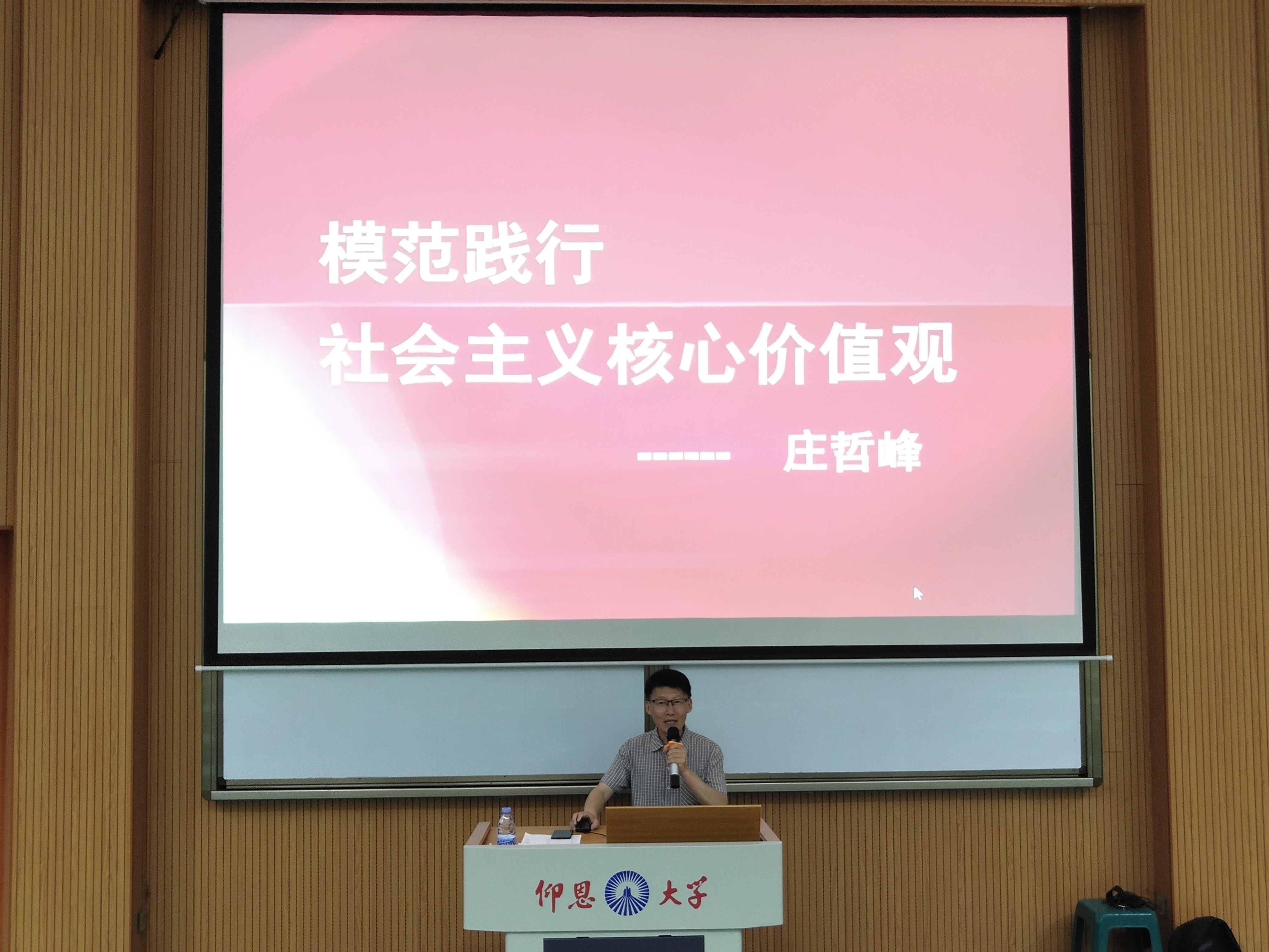 紧接着,庄哲峰书记以《模范践行社会主义核心价值观》为题,分别从价值观和核心价值观的基本概念 、社会主义核心价值体系基本内容以及模范践行社会主义核心价值观三个部分“谈践行”。他强调当代大学生要加强学习钻研,在“知”上下功夫,做到学而不厌,学有所思,学有所得;其次,要注重感同身受,在“信”上下功夫,通过建立积极心态,体会制度优越性,学习先进典型认同社会主义核心价值观;再者,要着力实践养成,在“行”上下功夫,将社会主义核心价值观融入到文化普及、宣传工作、各种精神文明创建活动和日常生活中,努力在“落细”“落常”“落实”和“此身”“此地”“此时”上下功夫,不断反省和完善自我。