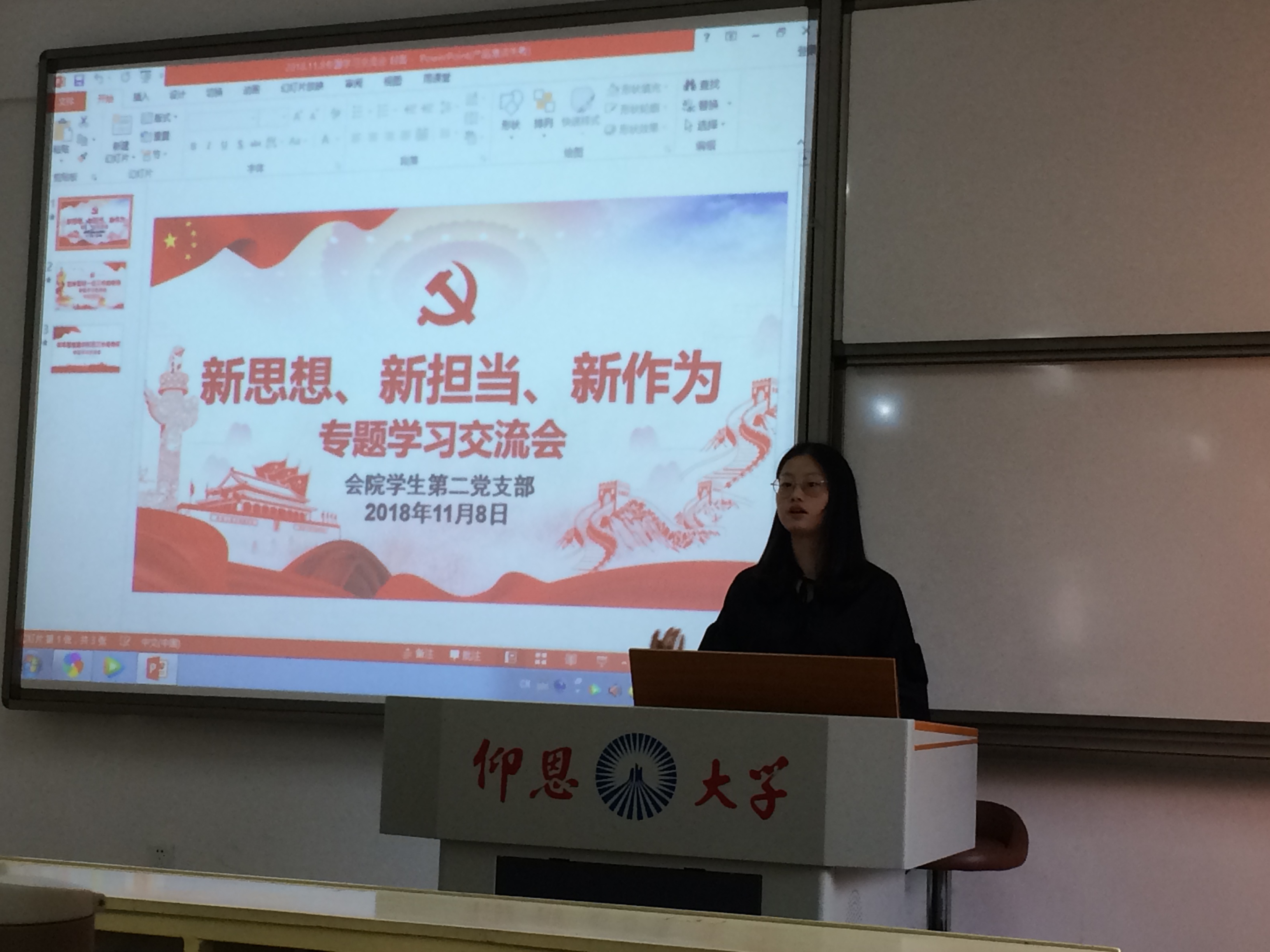 九游体育官网学生第二党支部于2018年11月8日16:00在第一教学区吉龙楼304开展了“新时代、新思想、新担当、新作为”专题学习交流会,在学习交流会上,党员同志们积极进行学习交流与分享。