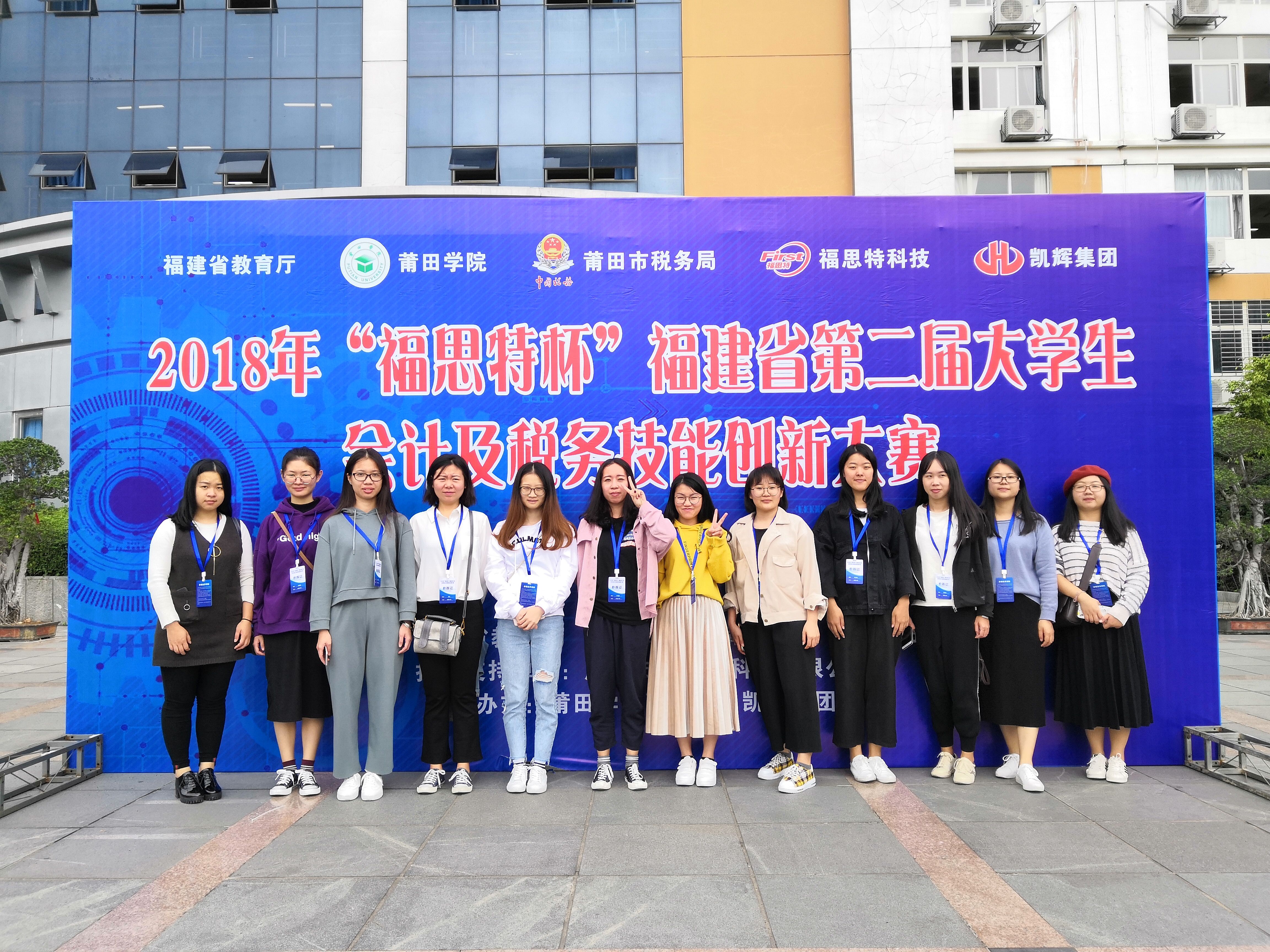 2018年“福思特杯” 第二届福建省大学生会计及税务技能大赛是由福建省教育厅主办、莆田学院与莆田市税务局联合承办。 本次比赛共吸引来自福州大学、华侨大学、福建农林大学、九游体育官网等41所院校近500名参赛选手及指导教师前往参加比赛。我校共有12名学生在林秋花老师的带领下赴赛。