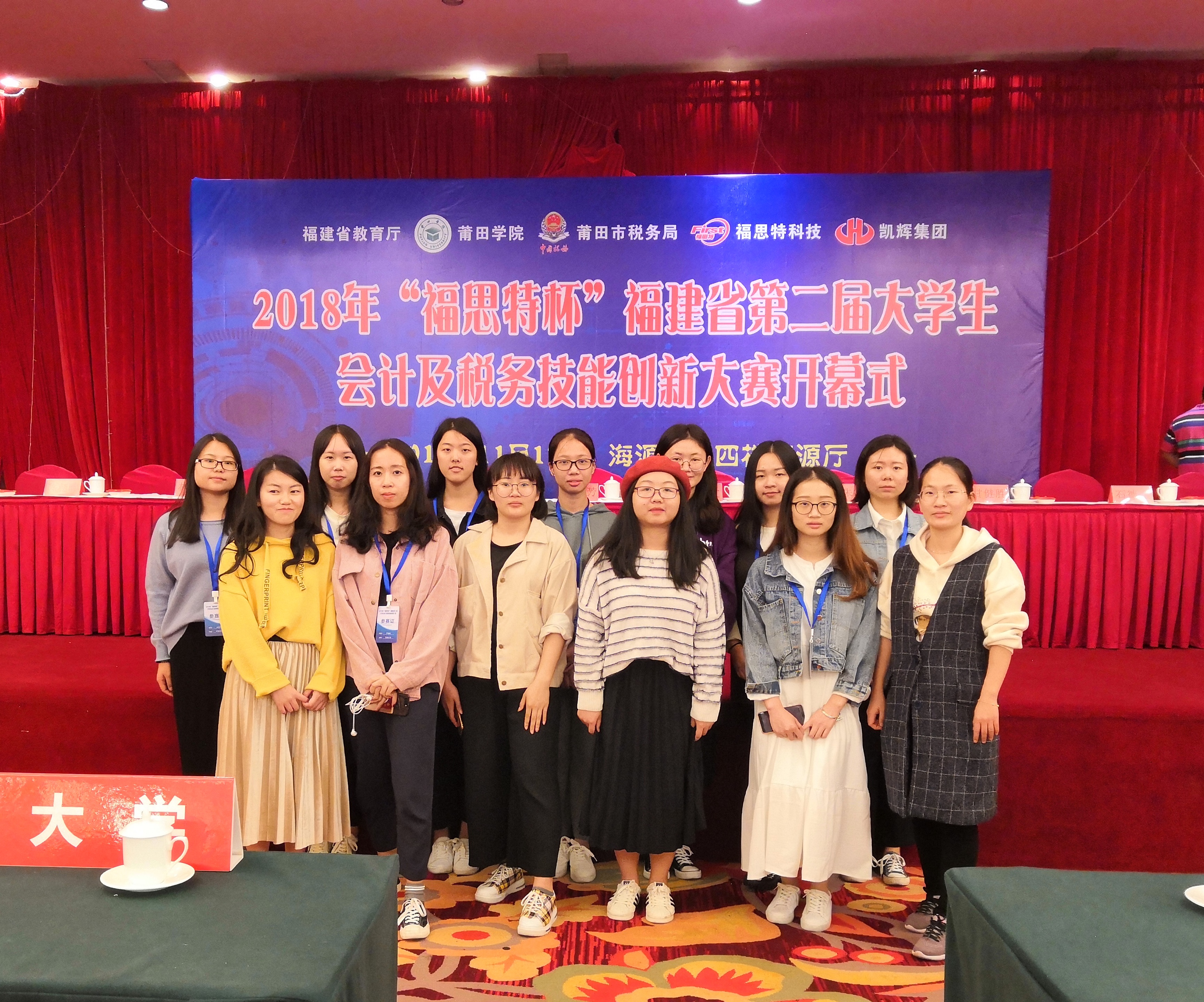 2018年“福思特杯” 第二届福建省大学生会计及税务技能大赛是由福建省教育厅主办、莆田学院与莆田市税务局联合承办。 本次比赛共吸引来自福州大学、华侨大学、福建农林大学、九游体育官网等41所院校近500名参赛选手及指导教师前往参加比赛。我校共有12名学生在林秋花老师的带领下赴赛。