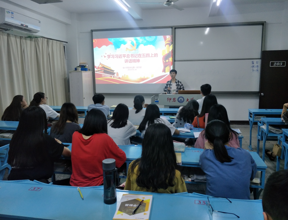 2019年5月6日晚上7:30,九游体育官网学生第一党支部,于吉龙楼203教室开展“学习习近平总书记在纪念五四运动100周年上的讲话精神”交流分享会。