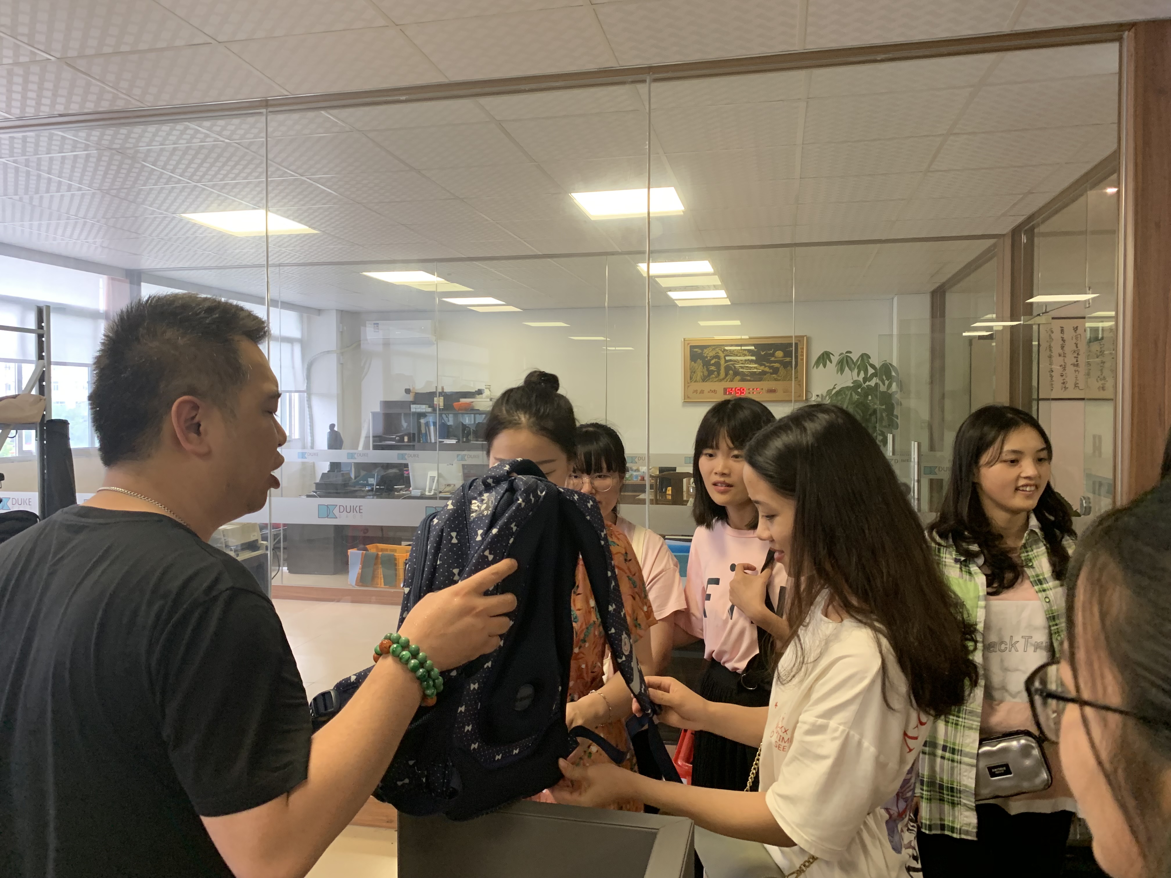参观学习前,同学们认真了解杜可箱包公司的相关简介,指导老师李曦还以杜可公司具体的经济业务为例,让同学们思考如何做账的问题。带着问题,同学们在杜可公司董事长杜增堤先生的带领下走访了生产车间和仓库,参观了近20条生产线和1个柔性智能设计工作室的工人们的机器操作过程。杜增堤先生耐心地为同学们讲解公司的生产流程和产品特色,鼓励同学们好好珍惜在大学的学习机会,以后用自己的所学实现人生理想,同学们备受鼓舞,气氛活跃。
