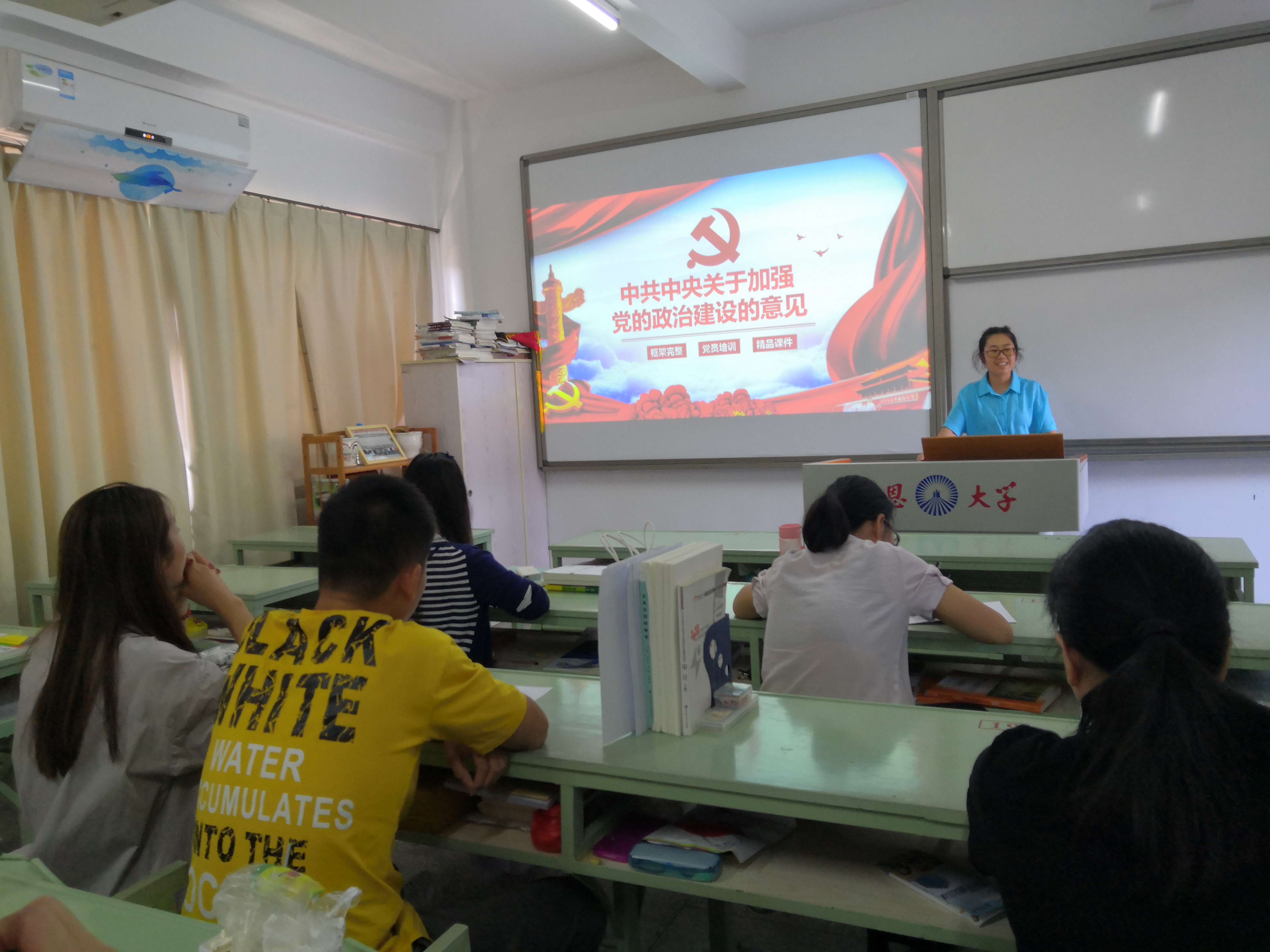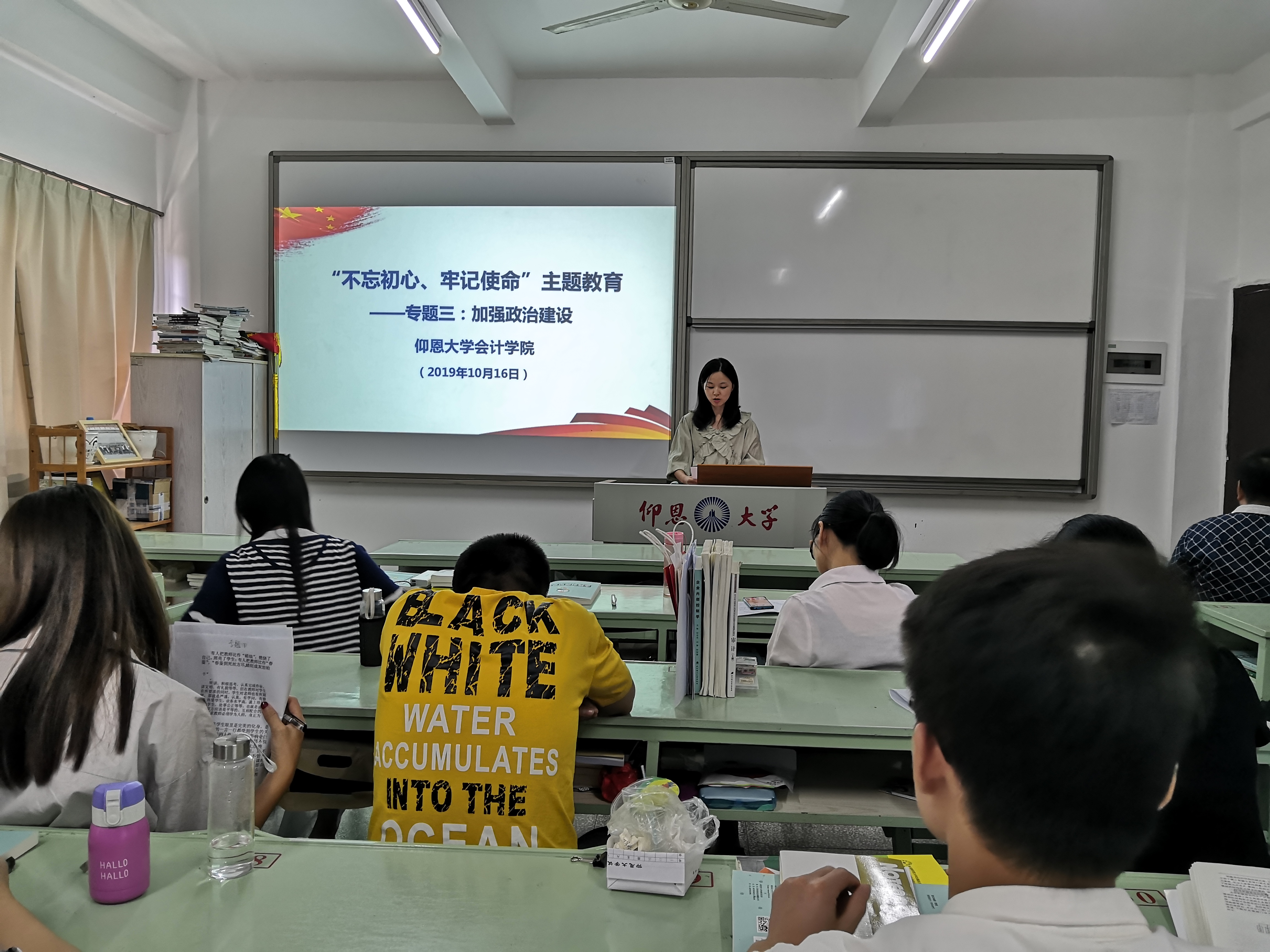 2019年10月16日下午2:30,九游体育官网党总支在吉龙楼108教室召开“不忘初心、牢记使命”主题教育专题三“加强党的政治建设”学习研讨会,学院全体教师党员、学生党员代表参加会议。