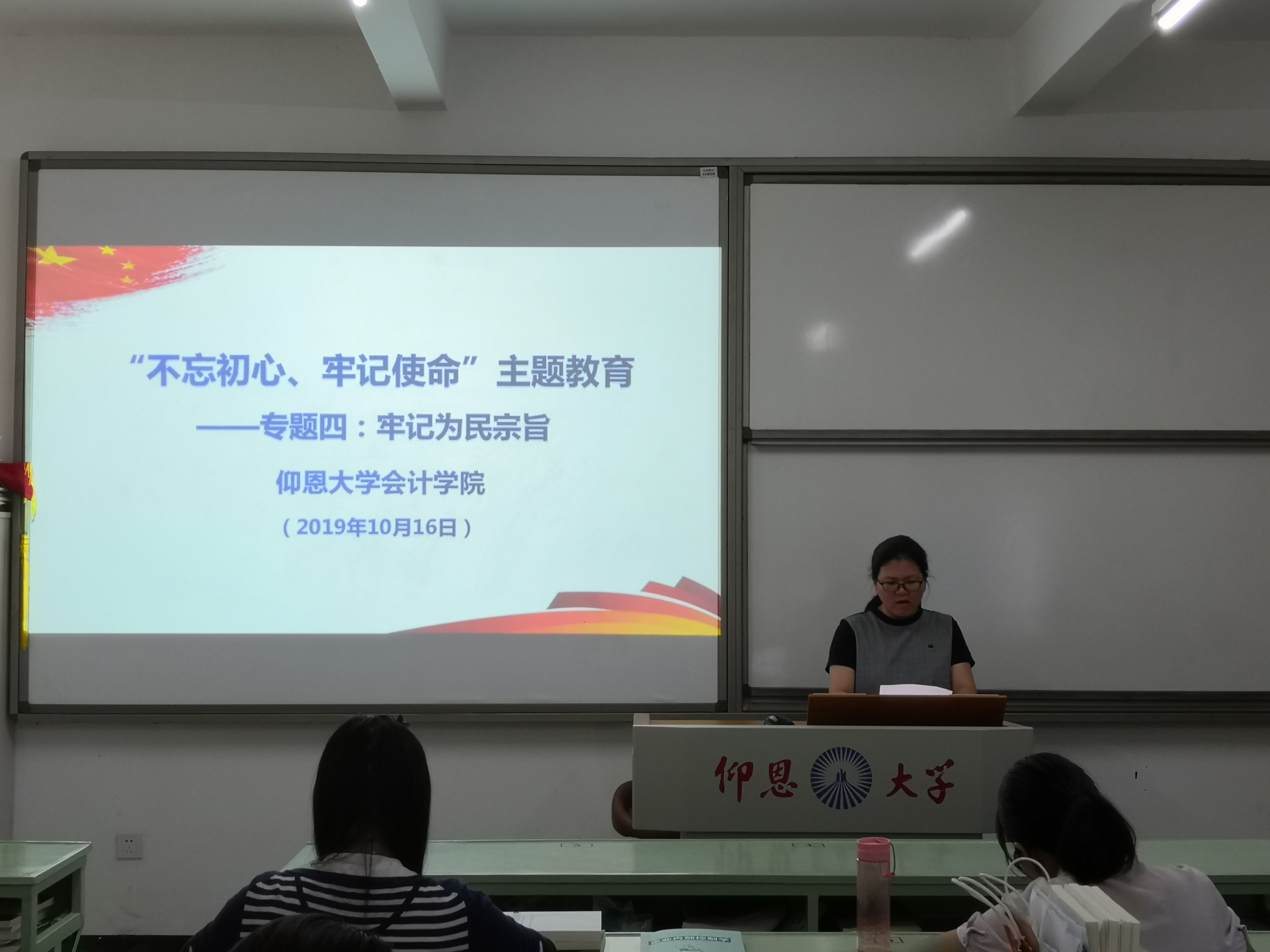 2019年10月16日下午2:30,九游体育官网党总支在吉龙楼108教室召开“不忘初心、牢记使命”主题教育专题四学习研讨会,学院全体教师党员、学生党员代表参加会议。