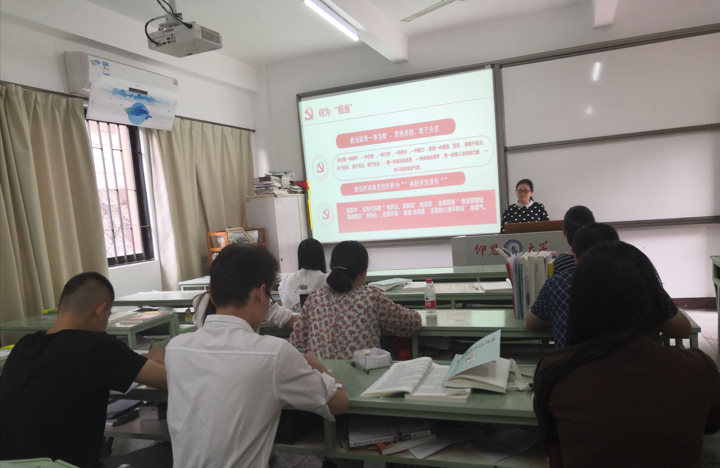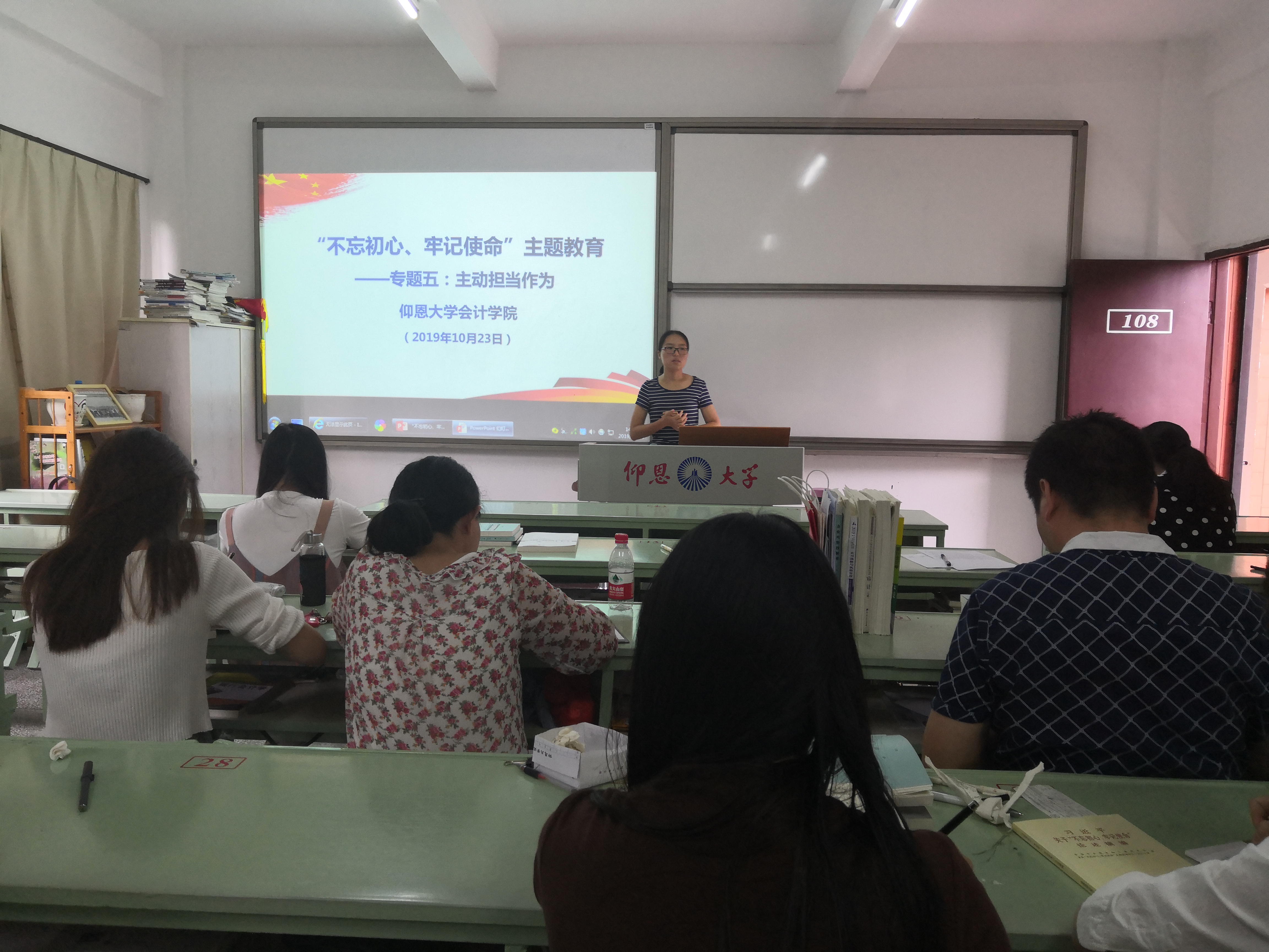 2019年10月23日下午2:30,九游体育官网党总支在吉龙楼106教室召开“不忘初心、牢记使命”主题教育专题五“主动担当作为”学习研讨会,学院全体教师党员、学生党员代表参加会议。