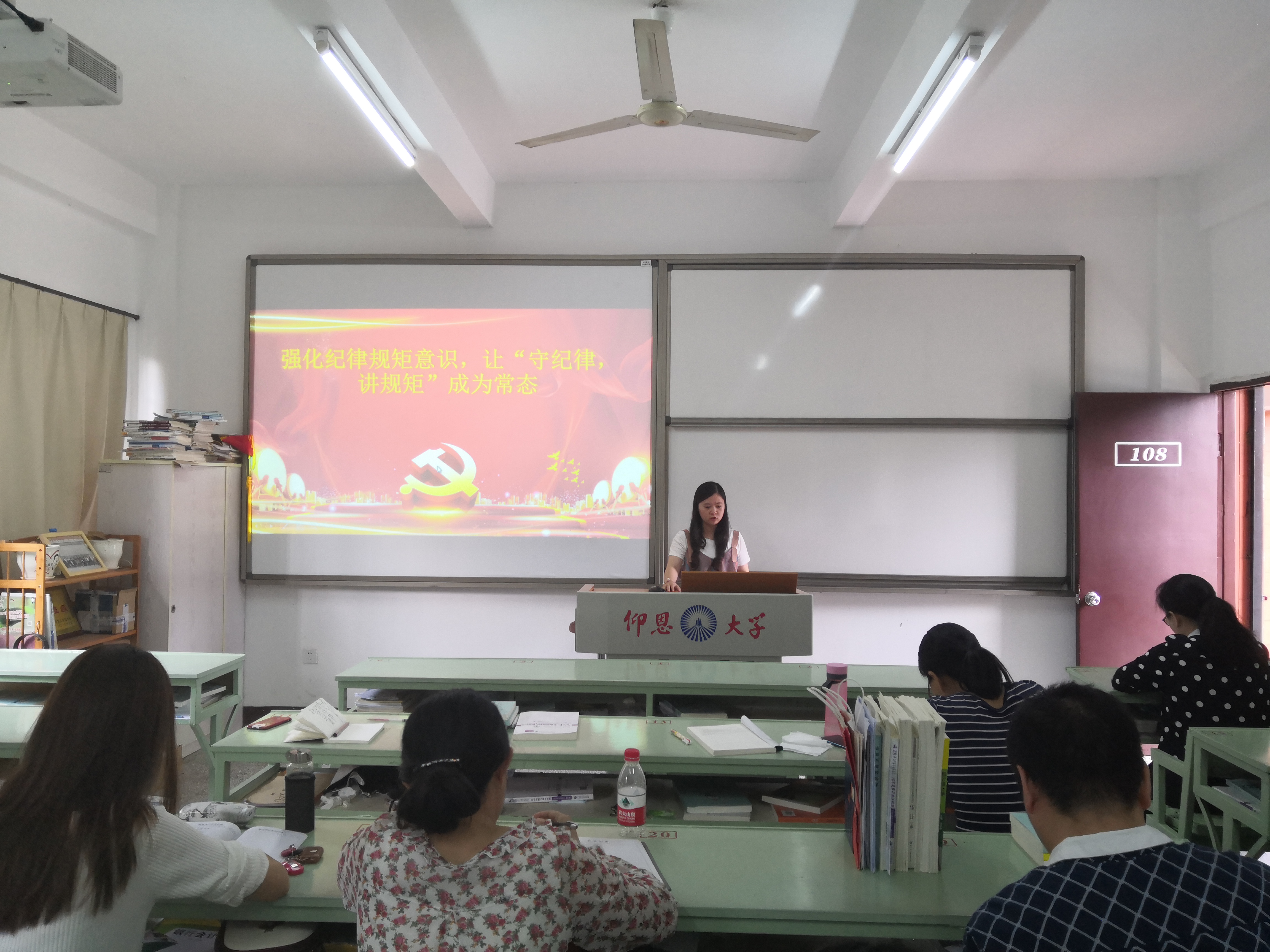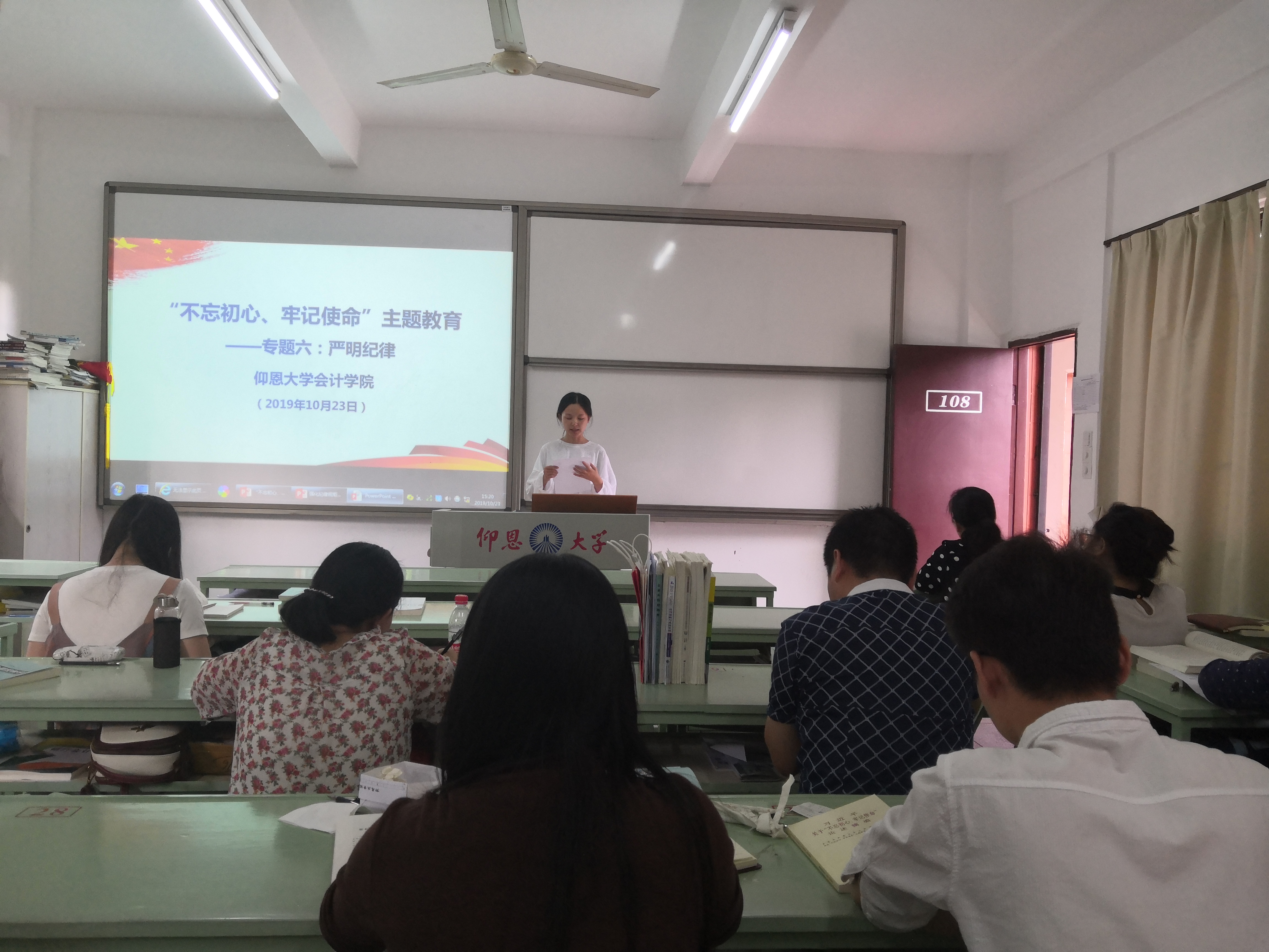 2019年10月23日下午2:30,九游体育官网党总支在吉龙楼106教室召开“不忘初心、牢记使命”主题教育专题六“严明纪律规矩”学习研讨会,学院全体教师党员、学生党员代表参加会议。
