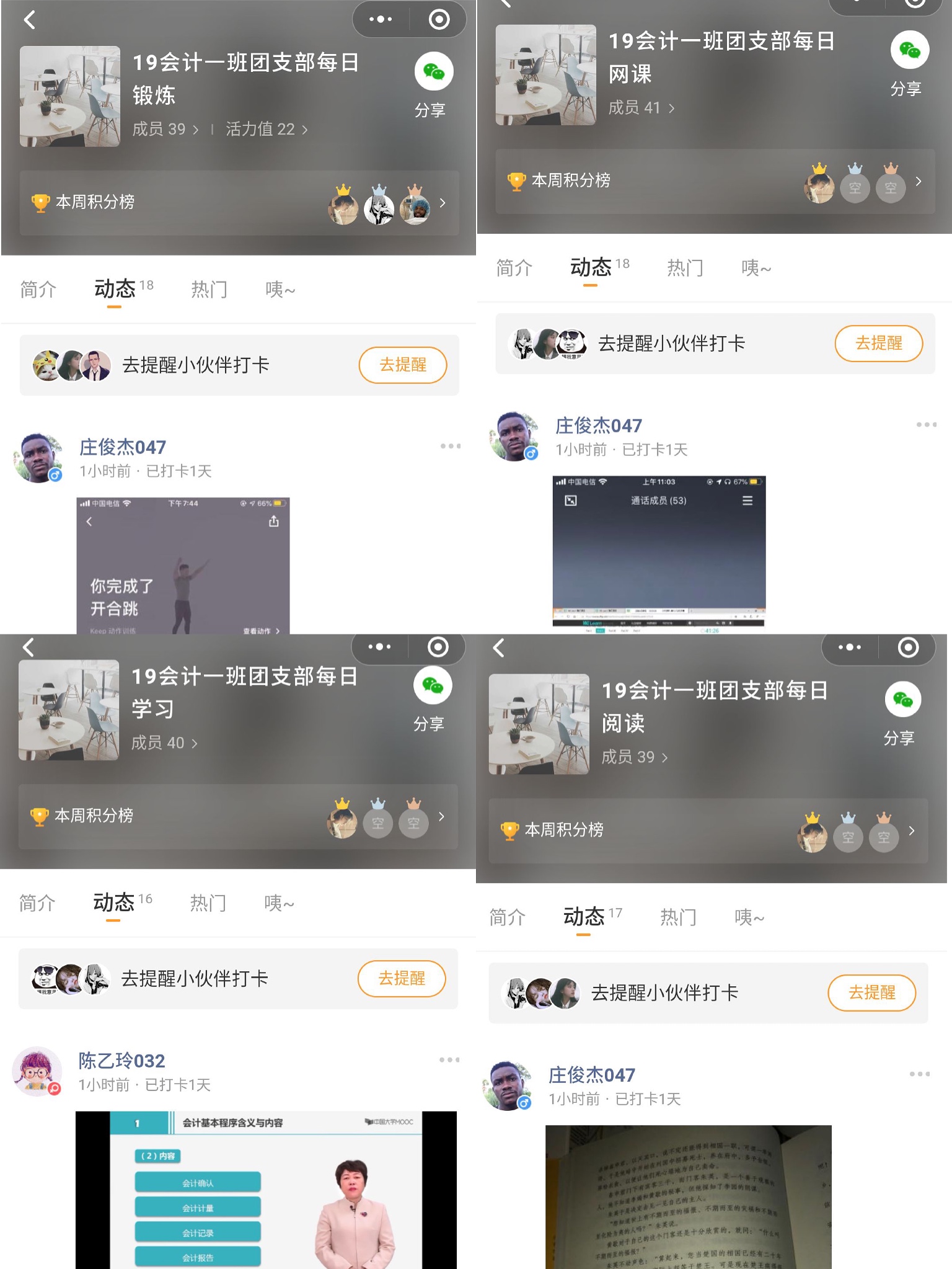 本次团日活动的开展,依托线上网络资源,经班委集体讨论研究,最终确定具体活动方案。本次团日活动,形式多样,内容丰富。组织在微信班级群召开以“青春战役 共克时艰”为主题的线上班会,加强对团支部青年的思想教育;组织并鼓励团员青年创作一批青年喜闻乐见,内容积极,形式丰富的网络文创作品,充实团员青年精神文化生活,引导团员青年正确认识疫情;开展“青春战疫,共克时艰”的线上健康生活打卡活动,组织开展每日学习、每日阅读、每日网课、每日运动等线上打卡活动,引导青年规律作息,坚持学习锻炼,努力提升自我。