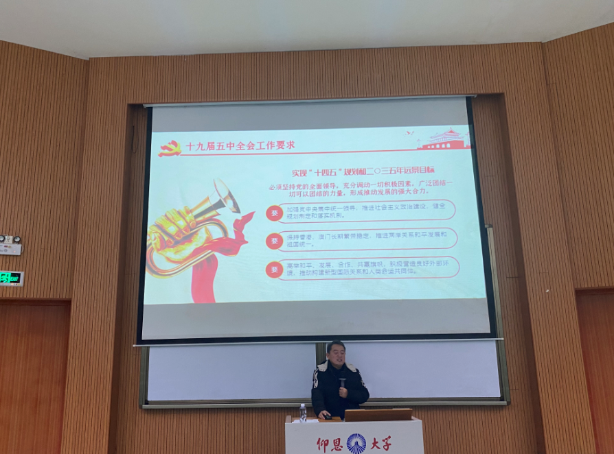 为深入学习贯彻党的十九届五中全会精神,12月21日下午,九游体育官网邀请了马克思主义学院直属党支部书记兼常务副院长李克钦作学习贯彻党的十九届五中全会精神专题宣讲报告。报告会由九游体育官网党总支书记高雪琪主持,全院教师、党员和积极分子到场聆听。