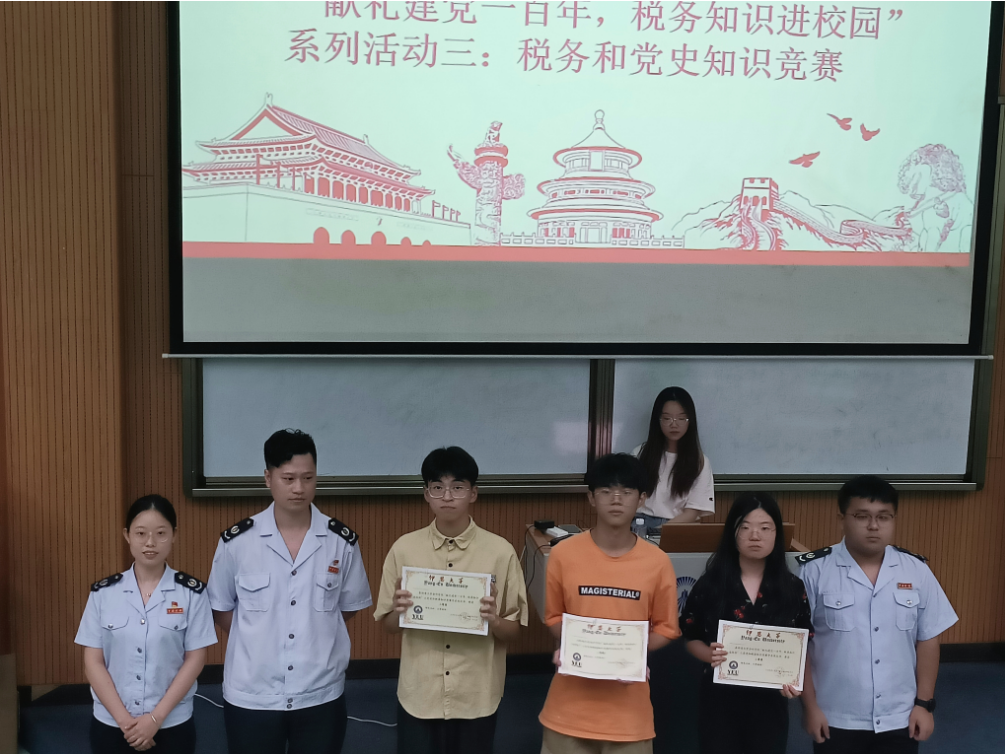 整场比赛以党史和税史光辉历史为轴、以党史和税务知识为线来展开,内容涵盖了建党百年以来的艰苦岁月和辉煌历程、税务等多方面的知识,竞赛采用线上限时答题、线下必答题、抢答题和风险题多环节进行。比赛现场,参赛队员配合默契、反应迅速、对答如流,展示了扎实的理论功底。经过四个环节的激烈角逐,郭建兵、陈丹、谢颖、王民民、王文滨等5名同学获得了本次知识竞赛的一等奖。