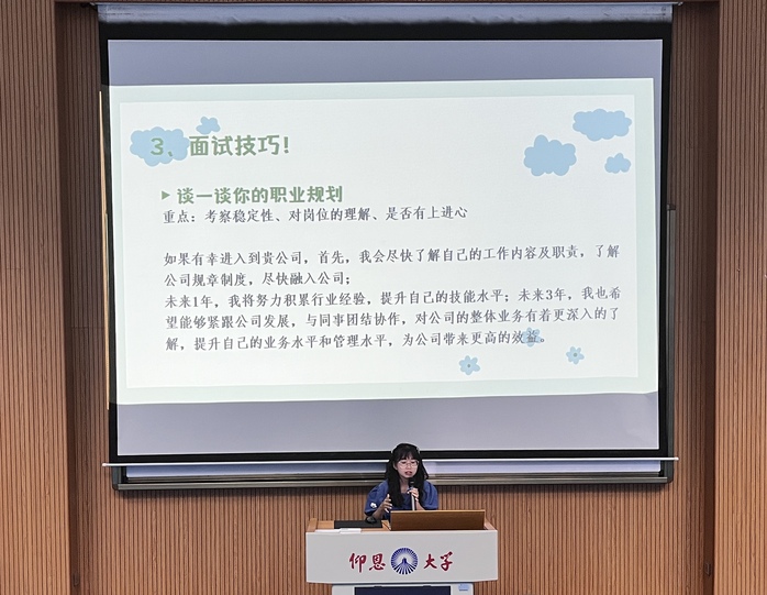 游伟达学长分别从考公流程、学习重点等方面传授自己的经验,并强调“自信、流利、大声”是面试中的关键。翁宋伟学长分享了学习计划表,在考公期间应按照自身学习习惯进行规律性的刷题,合理的时间安排才能提高学习效率。沈婷姗学姐结合求职经历,对如何选择合适的企业和岗位进行详细的讲解,入职前熟知企业各方面的情况是必不可少的环节。林桂雪学姐介绍了简历的重要性,她指出简历上不仅要突出自身的优点,还要根据不同企业的需求实时更改,做好充足的准备。郑沁怡学姐则浅谈银行上岸的经历,针对报考银行的类型和选择求职的岗位展开深入交流。同时学姐学长们也对同学们提出相关的问题进行解答。