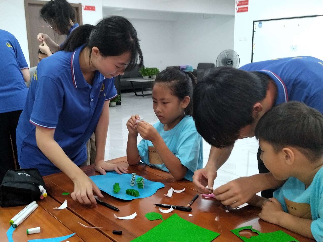 实践队员们先通过与孩子们互动问答,来增加他们对防溺水安全知识的储备。滴水孕育生命,卡纸裁剪希望。在手工课上,实践队员们耐心地为小朋友讲解剪纸知识,播放剪纸教程视频,发放剪纸材料。在实践队员们的引导下,孩子们和实践队员们用彩纸剪贴出了一幅幅具有创意性的作品。最后,实践队员们展示了自制滤水器,激发起孩子们的创作兴趣。