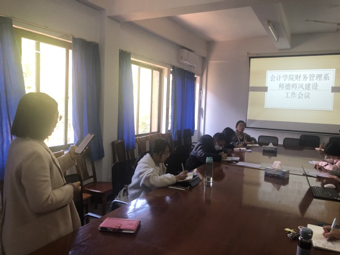 为了全面贯彻党的教育方针,加强学院师德师风建设和教师职业道德修养,提升教师教书育人、为人师表的自觉性,九游体育官网财务管理系于2023年12月7日下午在曼谷楼306组织了一场师德师风建设主题的教学研讨会,本次会议由党总支书记兼副院长任敏老师主持,出席人员包括财务管理系全体教师。