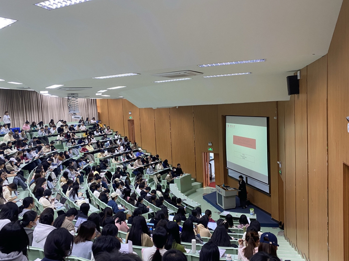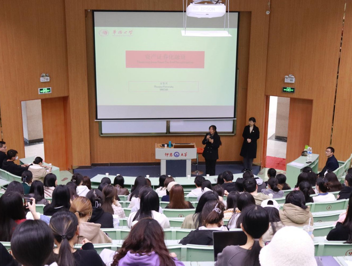 讲座中,曾繁英教授首先介绍了中国资产证券化现状,紧接着她以“北京和深圳的中信证券大厦”、“泉州刺桐大桥项目融资”等实例,分析资产证券化的参与主体等知识点,在案例中将底层资产这一概念清晰地铺展开。对于资产证券化这个知识点,现场同学们也都能聚精会神听讲,提笔在纸上写写画画,以便知识能入脑、人心。