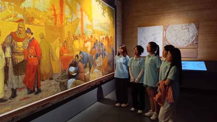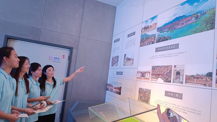 队员们首先在“碧海云帆”展厅参观一幅名为《隆庆开海图》的古画。这幅珍贵的画作生动地描绘了明代漳州沿海地区的海上丝绸之路贸易场景,展现了当年漳州作为重要港口城市的繁荣与开放,实践队员们也感受到了漳州人民的智慧和勤劳。随后,实践队员们前往二楼,参观了著名的历史文化名镇—洪坑村。这个村庄以其独特的红砖建筑群而闻名,是了解漳州传统文化的重要窗口。在这里,他们不仅聆听了关于洪坑村的历史故事,还目睹了那些保存完好的传统建筑。这些红砖房屋见证了漳州地区悠久的历史和文化传承,也让他们对这片土地有了更加深刻地认识。