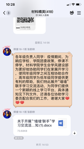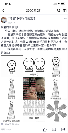 “墙墙”联手学习交流活动。随着线上课程学习的不断深入,同学们也开始遇到各种学习上的问题。为促进同学们之间的互动交流,帮助同学们解答疑惑,学生会创建了“beat365唯一官方网站交流学习墙”公众号,每天收集、整理并发布课程相关的各类问题,鼓励同学们通过评论区留言的方式进行交流互动,并邀请专业课老师、高年级同学参与答疑解惑,以此帮助同学们解决问题、拓展思路。