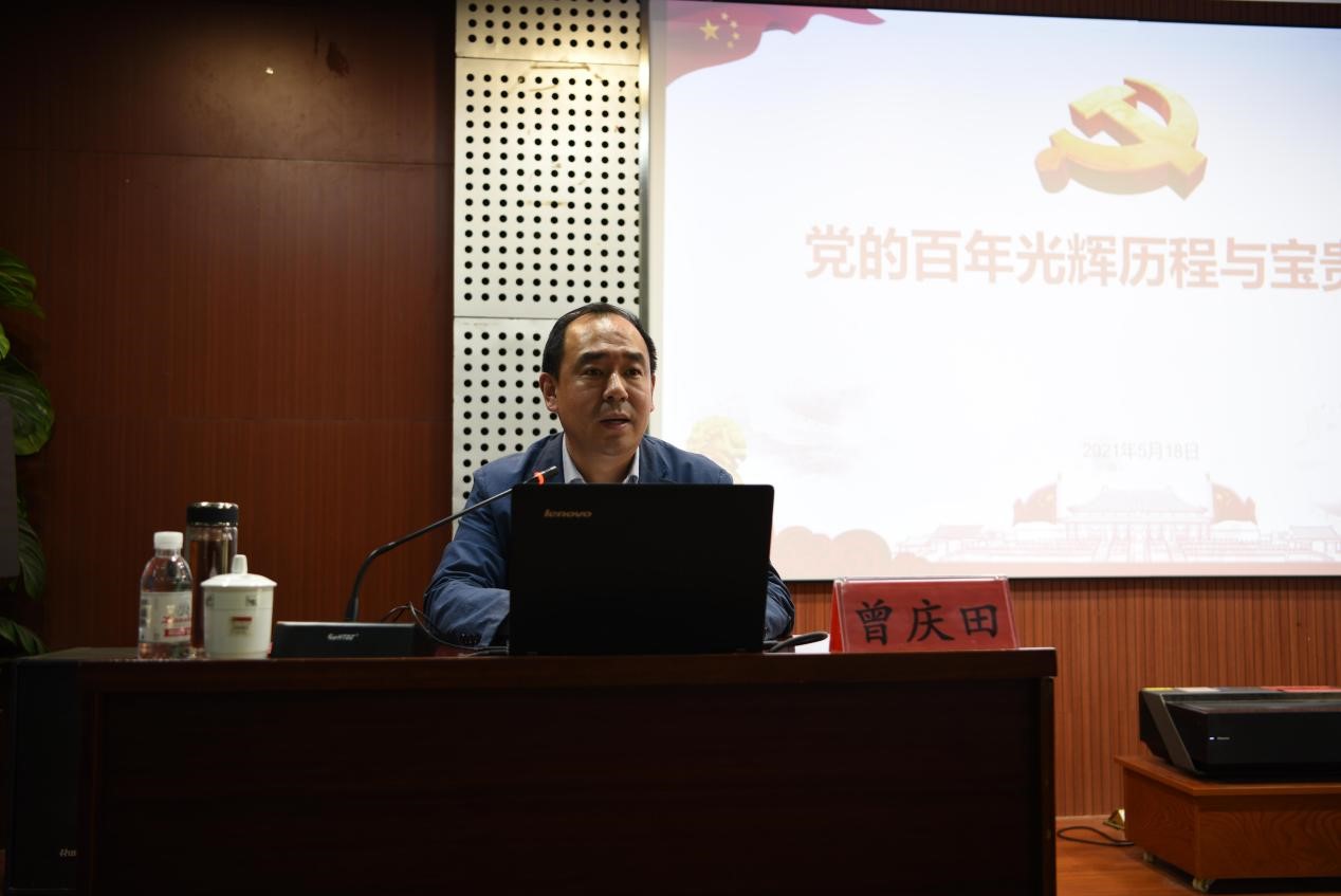 曾庆田从“百年党史之光辉历程”和“党史百年之宝贵经验”两个方面展开讲述。以时间为脉络,将百年党史之光辉历程分为“革命--救国”、“探索--兴国”、“改革开放--富国”、“攻坚--强国”四个阶段,通过大量数据、故事、图片,生动阐述了中国共产党百年光辉历程中缔造的丰功伟绩。从中国共产党的光辉历程中总结出“强大的真理伟力、坚强的领导核心、不变的根本宗旨、实事求是的思想路线、大无畏的自我革命精神、严明的纪律规矩、改革开放关键一招”等七条宝贵经验。