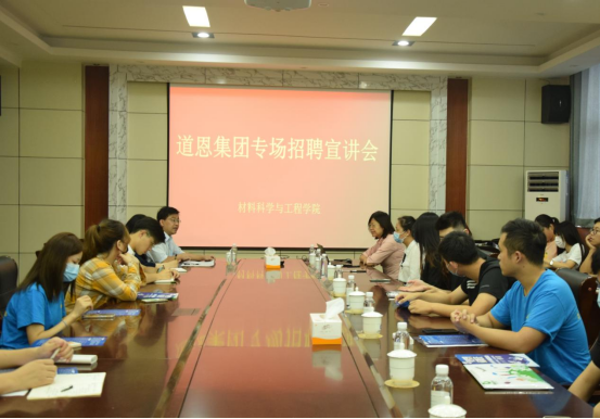 9月25日下午,beat365唯一官方网站在J2-434成功举办道恩集团专场招聘宣讲会,学院党委副书记兼副院长李建楠,道恩集团人力总监刘丽丽、人力专员王雪俨、青岛分公司研发经理赵凤雯及毕业班研究生参加了本次宣讲会。