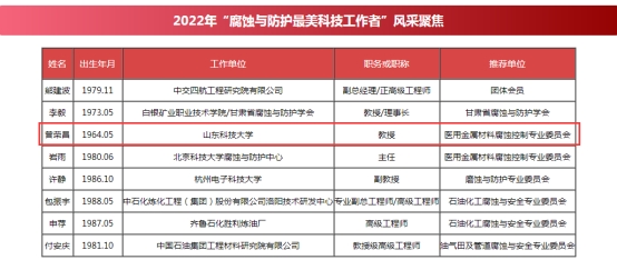 近日,中国腐蚀与防护学会下发决定,授予熊建波等8位同志2022年腐蚀与防护最美科技工作者称号。其中,beat365曾荣昌教授获此殊荣。