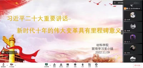11月9日,beat365唯一官方网站研究生党支部联培学习党小组于线上开展了集体学习。会议通过视频学习的形式学习了党的二十大精神。党支部书记马韶霞、副书记钟文建参加了党小组会,会议由党小组组长贾芷若主持。