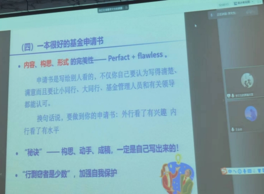 曾荣昌从基金前调研工作、基金申报成功的因素、标书撰写建议、案例分析四个方面,介绍了申请国家自然科学基金的经验。曾老师指出,申报既要推陈出新,又要具有较强的可实施性,研究方向一定要紧跟国家科研大势。他建议大家要重视申报书的质量,请专家问诊把脉,认真打磨申报书,凝炼科学问题与创新点,以期获得好的回报。李文生指出国家自然科学基金主要资助自然科学研究——基础研究,应避免采用产业化相关材料申报基金的“误区”,同时强调基金申报的“行、真、新、深”。丁建旭从“选题”和“创新”在申报国家基金过程中的重要性,指出细节决定成败,课题要紧扣科学问题,小而精,不要过高、过大、过难。最后,刘成宝就科研选题与思路、科学问题的理解、申请书的“深”与“广”、申请书的撰写体会等方面进行了详细介绍。