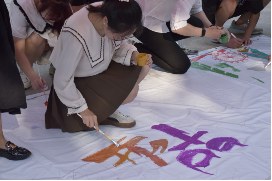活动过程中,教师代表及毕业生代表们积极参与,用心描绘出“我们毕业啦”等文字,绘制了鸽子、学校标志性建筑等图案,进行了创意涂鸦和留言,部分同学还留下了彩色手印,现场创意无限,充满欢声笑语。绘制完成后,作品将在J2号楼东侧进行展示。