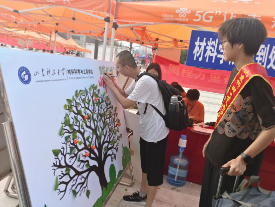 为热烈欢迎2023级新生,学院特地为新生精心准备了一系列有纪念意义的活动。“育苗成‘材’,向阳而生”活动,通过邀请新生在树叶上写下自己的期许、在果实上写下希望,并点缀在生命之树上,寓意着希望新生们能够播种希望,像大树一样成长成才,向阳而生;“满‘新’欢喜遇见你”活动通过邀请新生到“材通穹宇,料定天下”的院训景观前合影留念,留下在科大的第一帧,希望同学们能够牢记院训,在材料行业有所建树,争做国家栋梁。与以往不同的是,今年新生家长可以入校接送,学院特邀请图书馆馆长崔然带领新生家长参观了图书馆;安排了新生家长座谈会,帮助家长熟悉了解专业现状及发展情况,以形成家校合力,共同帮助学生尽快成长;最后,辅导员陪同新生家长走进了学苑餐厅,参加了后勤管理处组织的品鉴午餐活动。