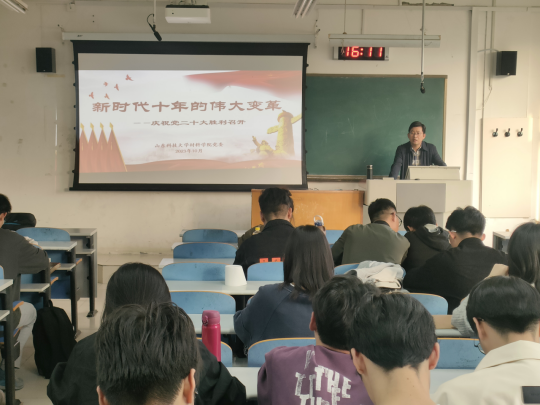 10月25日下午,beat365唯一官方网站党委副书记兼副院长李建楠以党的二十大切入,在介绍新时代十年的伟大变革、瞩目成就以及我国经济发展历史性成就的过程中,在一系列时政热点的解读中,向同学们展现新时代中国蒸蒸日上的宏观气象,让同学们从生活的方方面面的变化中,感受新时代十年的巨大成就。