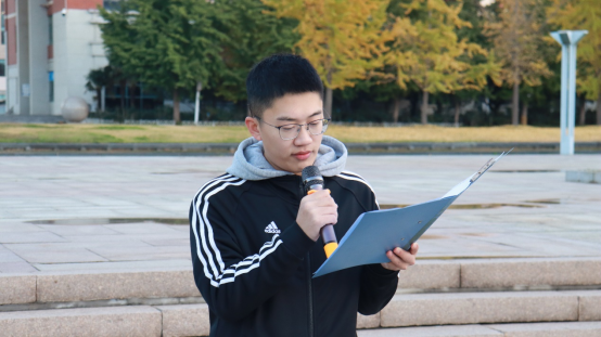 随后,学生代表材料化学2020-2班常源智,在国旗下发表了题为《激扬鸿鹄志,奋斗砺青春》的演讲。常源智从“有理想,敢担当,能吃苦,肯奋斗”四个方面鼓励广大材料学子砥砺前行、无悔青春。他呼吁全体同学:“作为一名材料学子,要有'材通穹宇,料定八方'的气魄担当,努力学习专业知识和技能,立足学习科研主战场,主动对接国家重大战略发展方向,勇敢面对,挑战并战胜苦难,走好新时代的长征路。”