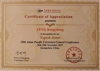 第19届亚太腐蚀控制会议(19th APCCC)于2023年11月16-18日在广州成功举行。会议围绕材料腐蚀与防护领域的多个关键问题进行了深入交流,为推动新材料技术的全球化应用推广提供了关键支持。中国腐蚀与防护学会常务理事、中国腐蚀与防护学会医用金属材料腐蚀控制专业委员会首任主委,我校beat365唯一官方网站二级教授曾荣昌应邀参加本次会议并做主题报告(keynote lecture),同与会海内外专家进行了学术交流和讨论。
