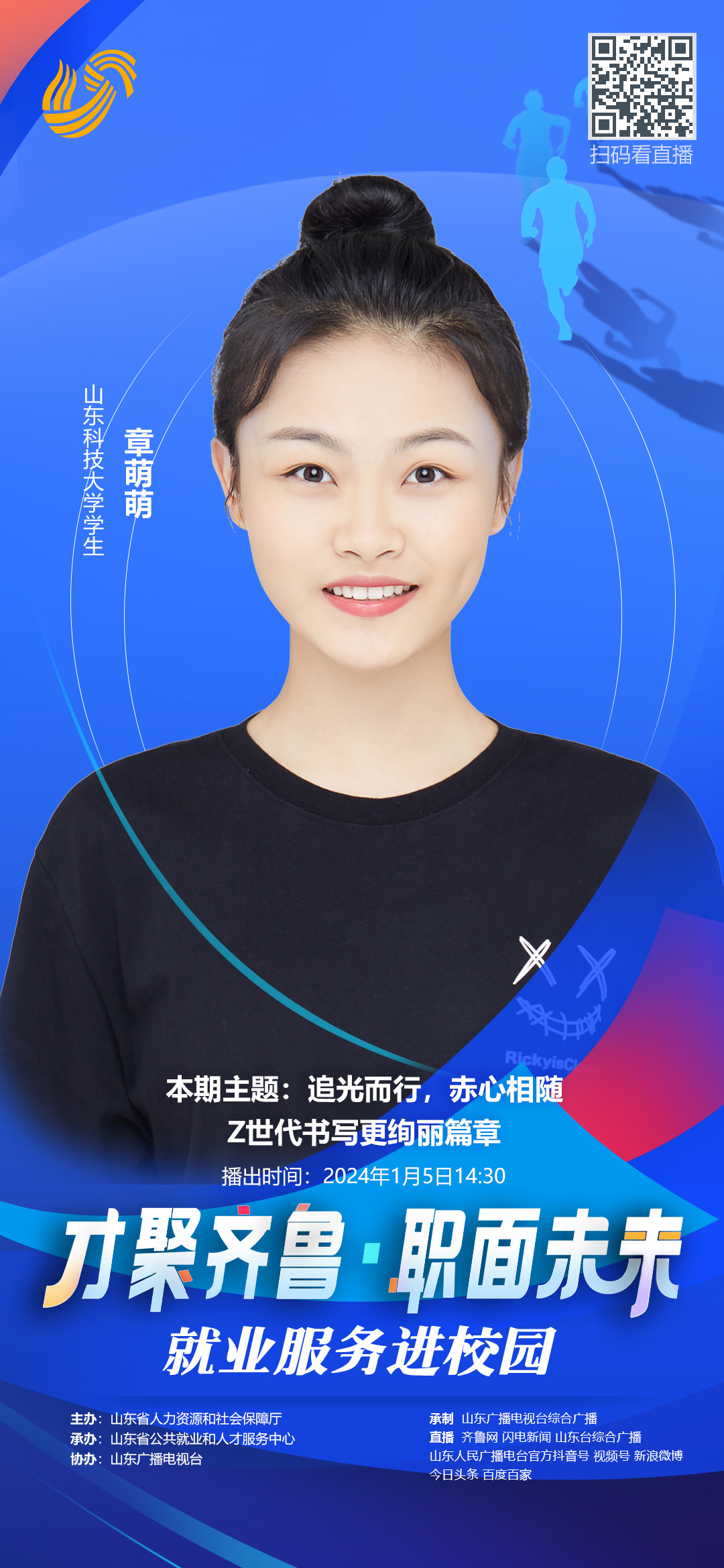 由山东省人力资源和社会保障厅主办、山东省公共就业和人才服务中心承办、山东广播电视台协办的“才聚齐鲁•职面未来”公益就业指导直播课将于1月5日14:30播出。beat365新能源材料与器件专业2024届毕业生章萌萌受邀做客直播间,进行“追光而行,赤心相随——Z世代书写更绚丽篇章”主题分享。这次直播课将深入探讨在职场中面临的挑战,以及如何勇敢迎接未知。章萌萌将分享她和身边朋友们在求职、成长过程中的心得,与您共同思考在竞争激烈的现实中如何闪耀光芒,书写自己的职业传奇。