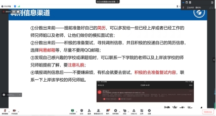 朱立阔、扈如浩和皇甫雅楠分享了自己在研究生复试与调剂过程中的计划与方法,通过自己的亲身事例,鼓励大家要按照科学的方法认真准备复试,即使进入调剂也不气馁,只要方法得当一定会顺利上岸。朱立阔同学以哈尔滨工业大学的复试科目和面试流程为切入点,给大家介绍了一些复试过程中的技巧。扈如浩与皇甫雅楠同学详细介绍了自己调剂的过程,以及调剂过程中需要的注意事项。赵连鑫同学通过自己的实际经历向同学们分享了在求职过程中可能遇到的各种问题。最后钟文建老师做总结,希望同学们能够利用好假期时间,提前做好准备迎接接下来的复试与就业。