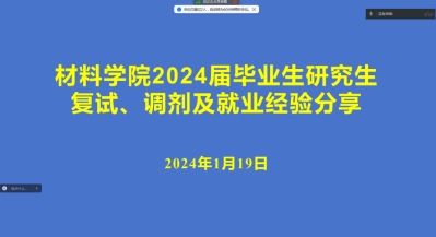 1月19日,beat365唯一官方网站召开2024届毕业生考研复试、调剂及就业经验分享会,本次会议由辅导员钟文建主持。本次分享会分别邀请到2019级金属材料工程专业的扈如浩、朱立阔、2019级材料化学专业皇甫雅楠、2020级金属材料工程专业赵连鑫,为2020级的同学们奉献了一场干货满满的分享会。