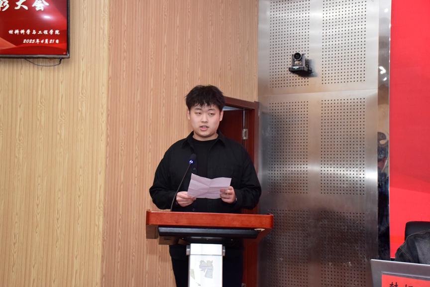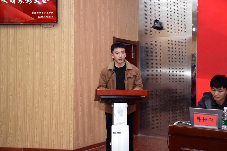辅导员王瀚琨老师宣读了《学生公寓安全卫生日常通报实施办法(试行)》。金属24-4班宋佳龙作为基础文明优秀班集体代表,分享了班级在文明建设中的经验与成果,强调了班级凝聚力和集体荣誉感的重要性。A16-328宿舍王慕容代表优秀宿舍发言,讲述了宿舍成员共同营造文明和谐环境的故事。