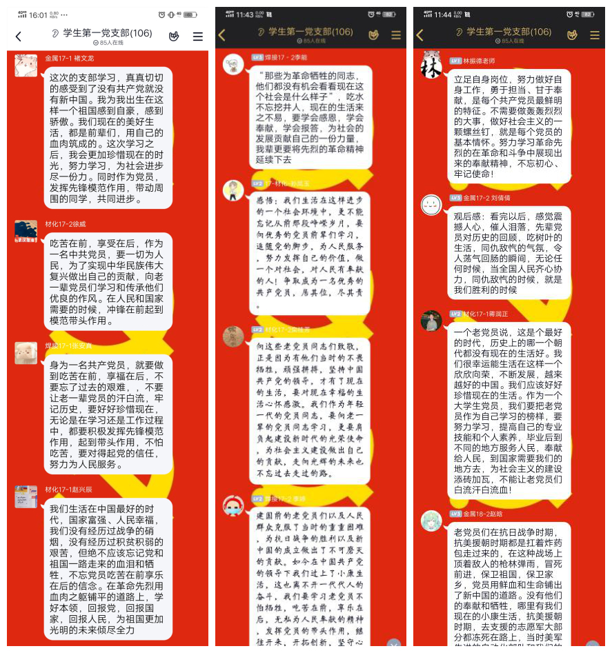 活动中,全体党员同志踊跃发言,分享了对老党员英雄事迹的感悟和对老党员们的尊敬及感恩之情,表达了作为青年党员的责任感和使命感。其中,李能、栾桂芳等同志表示,吃水不忘挖井人,现在的生活来之不易,要心怀感恩,向老党员们致敬。徐威、赵兴辰等同志表示,作为党员要不忘吃苦在前享乐在后的信念,要学好本领,回报党和国家。