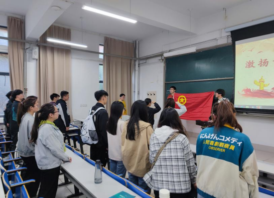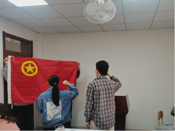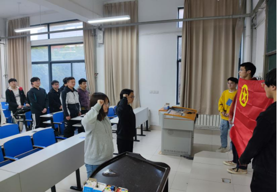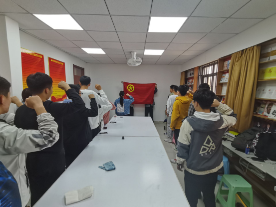 重温五四运动后,各支部进行了新团员入团宣誓和老团员重温入团誓词活动。在雄壮的国歌声中,全体同学庄严肃立,神情庄重;接着各班团支部书记说明了入团的意义并宣布了新发展团员名单,在全体团员的见证下由入团介绍人为新团员颁发团章、团员证和并佩戴团徽;随后各班团支部书记带领新团员进行入团宣誓,在鲜艳的团旗下,新团员举起右手庄严宣誓。青春誓言,高昂雄浑,表达了新团员对共青团组织的无限向往和为团组织增光添彩的豪豪迈激情。