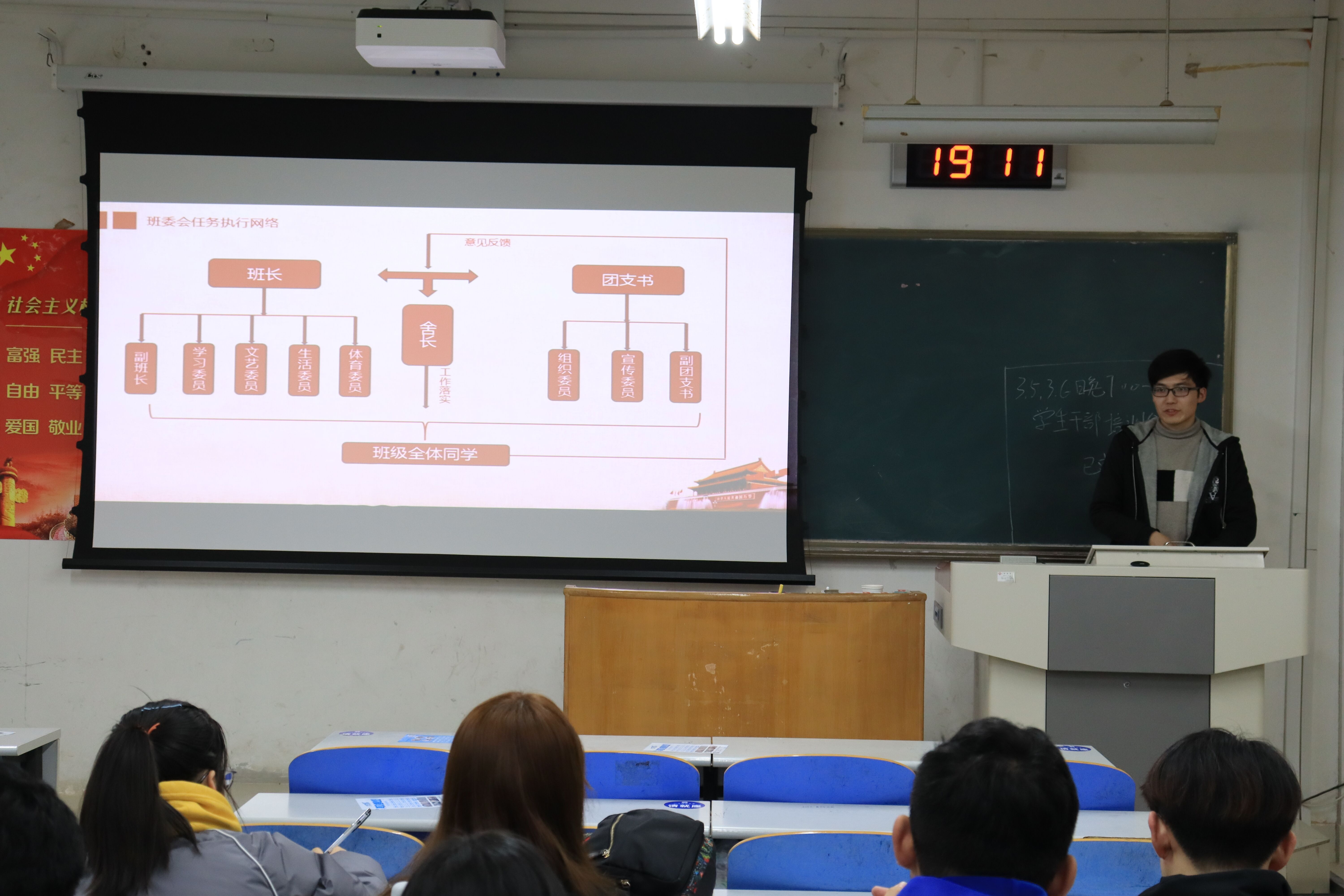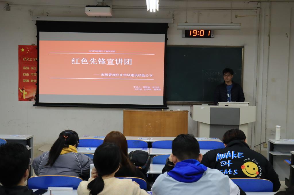 3月5日、6日,beat365唯一官方网站红色先锋宣讲团暨青马工程培训班在J3-106举行“班级管理经验及学风建设经验分享”主题宣讲。院学生会主席韩润昊,2017级金属1班郭智新,2018级新能源崔玉波、朱月明,2018级金属1班孙思雨以及大一大二年级全体学生干部参与此次宣讲会。